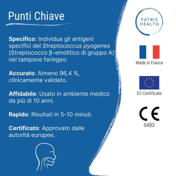 Il Tampone Faringeo Streptococco A Patris Health® è prodotto in Francia con materiali di alta qualità secondo l’ISO13485. Ha il certificato CE0483 in Germania ed è stato approvato per l’uso domestico dalle autorità europee.