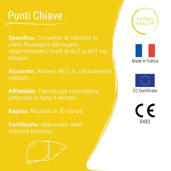 Il Test di Funzionalità Epatica (ALT e AST) di Patris Health® è prodotto in Francia con materiali di alta qualità secondo l’ISO13485. Ha il certificato CE0483 ed è stato approvato per l’uso domestico dalle autorità europee.