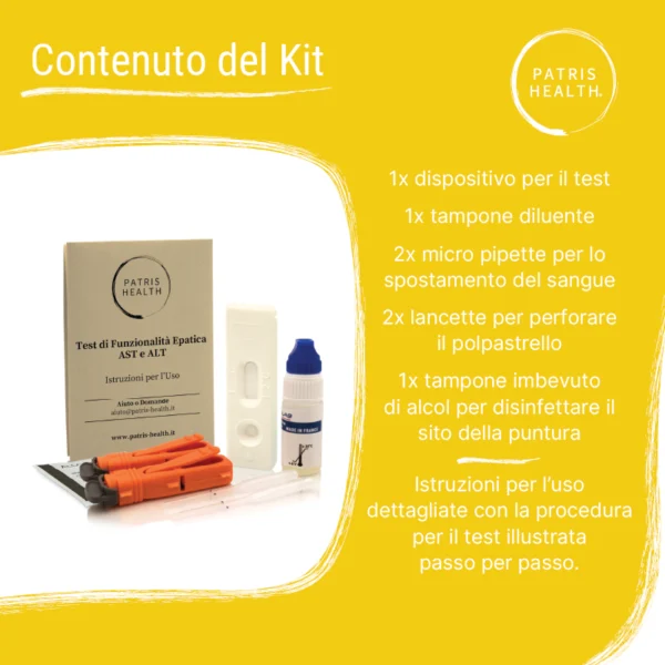Il Kit per il Test di Funzionalità Epatica (AST e ALT) Patris Health® include: