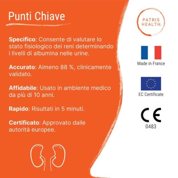 Il Test di Funzionalità Renale (Albumina) Patris Health® è prodotto in Francia con materiali di alta qualità secondo l’ISO13485. Ha il certificato CE0483 ed è stato approvato per l’uso domestico dalle autorità europee.