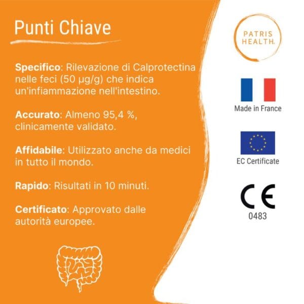 Il Test per la Calprotectina nelle Feci Patris Health® è prodotto in Francia con materiali di alta qualità secondo l’ISO13485. Ha il certificato CE0483 ed è stato approvato per l’uso domestico dalle autorità europee.